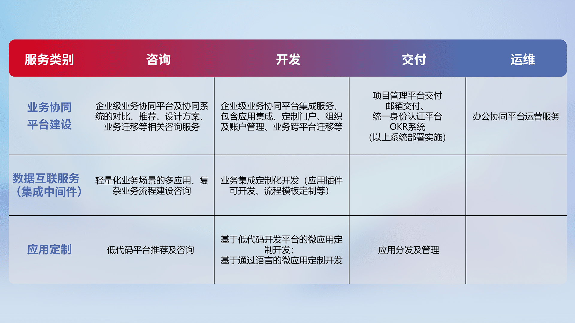 针对钉钉、、、、企微、、IDaas等平台级产品提供产品的规划、、、方案、、、交付、、定制化开发等服务,,,实现如统一协同办公、、智能客户服务、、、混合会议管理、、、、智能数据查询、、等业务场景,,,实现数字化转型。。